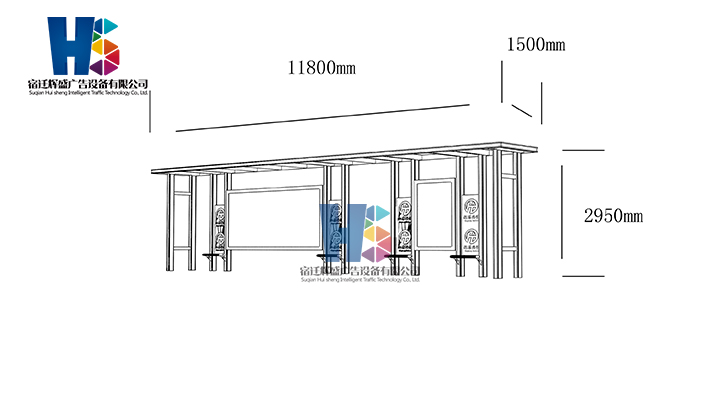 產(chǎn)品外觀 / PRODUCT DETAILS 產(chǎn)品信息 / PRODUCT INFO 【產(chǎn)品名稱】:新款候車亭HS47 【產(chǎn)品系列】:新款候車亭 【產(chǎn)品型號(hào)】:HS47 【產(chǎn)品規(guī)格】:長(zhǎng)11800mm 寬1500mm 高2950mm 【產(chǎn)品材質(zhì)】:熱鍍鋅鋼板 【使用年限】:10-15年 【詳情致電】:181-5189-0417、157-5170-8886 備注:產(chǎn)品可根據(jù)用戶需求選用材質(zhì)、顏色及配件,個(gè)性化定制。 1、表面采用靜電噴塑(氟碳烤漆/搪瓷處理) 2、頂棚采用100*100*1.5mm、100*150*2mm鍍鋅管,3mm鍍鋅板激光切割件、1.5mm鍍鋅板焊接骨架,鋪1mm鍍鋅板(10mm陽(yáng)光板) 3、立柱采用150*150*3mm鍍鋅管 4、箱體采用1.5mm鍍鋅板折彎焊接成型,門框采用全玻鋁合金型材,視窗采用6mm鋼化玻璃 5、照明電器采用LED燈粒 產(chǎn)品尺寸 / PRODUCT SIZE 關(guān)于輝盛 / 為社會(huì)分擔(dān)責(zé)任,為客戶創(chuàng)造價(jià)值 宿遷輝盛廣告設(shè)備有限公司是一家集設(shè)計(jì)、研發(fā)、生產(chǎn)為一體的城市公共設(shè)施生產(chǎn)型企業(yè)。主要產(chǎn)品有:候車公交亭、公交站臺(tái)、閱報(bào)欄、路名牌、垃圾箱、燈箱等市政設(shè)施系列產(chǎn)品和工程配套設(shè)施系列產(chǎn)品,現(xiàn)有高級(jí)技師30多人,高級(jí)職稱設(shè)計(jì)人員10人,是一家具有自主開發(fā)和設(shè)計(jì)能力的以公交亭、智能公交為主導(dǎo)的綜合性城市公共設(shè)施制造企業(yè)。為了進(jìn)一步改善生產(chǎn)工藝,提高產(chǎn)品質(zhì)量,公司引進(jìn)了先進(jìn)生產(chǎn)設(shè)備,包括立臥式加工中心,工業(yè)涂裝流水線,CNC車床,線切割機(jī),大型數(shù)控板機(jī),數(shù)控折邊機(jī),數(shù)控沖孔機(jī)床,大型折彎?rùn)C(jī)等。公司還專門成立了產(chǎn)品研發(fā)部門,現(xiàn)每年自主開發(fā)或應(yīng)客戶要求設(shè)計(jì)推出多款新產(chǎn)品。 榮譽(yù)資質(zhì) / ENTERPRISE HONOR