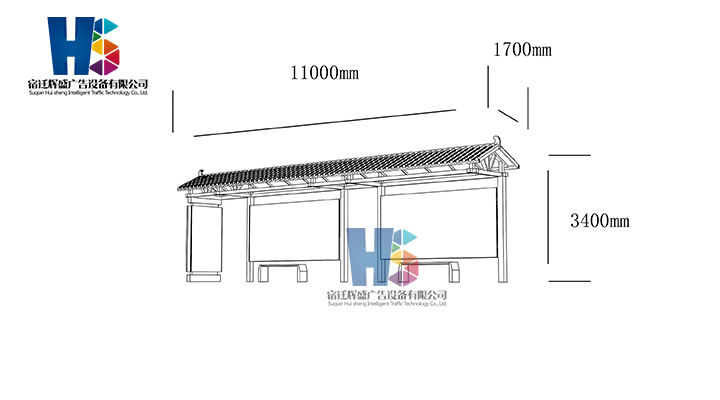產(chǎn)品外觀 / PRODUCT DETAILS 產(chǎn)品信息 / PRODUCT INFO 【產(chǎn)品名稱】:新款候車亭HS45 【產(chǎn)品系列】:新款候車亭 【產(chǎn)品型號】:HS45 【產(chǎn)品規(guī)格】:長11000mm 寬1700mm 高3400mm 【產(chǎn)品材質(zhì)】:熱鍍鋅鋼板 【使用年限】:10-15年 【詳情致電】:181-5189-0417、157-5170-8886 備注:產(chǎn)品可根據(jù)用戶需求選用材質(zhì)、顏色及配件,個性化定制。 1、表面采用靜電噴塑(氟碳烤漆/搪瓷處理) 2、頂棚采用100*100*1.5mm、100*150*2mm鍍鋅管,3mm鍍鋅板激光切割件、1.5mm鍍鋅板焊接骨架,鋪1mm鍍鋅板(10mm陽光板) 3、立柱采用150*150*3mm鍍鋅管 4、箱體采用1.5mm鍍鋅板折彎焊接成型,門框采用全玻鋁合金型材,視窗采用6mm鋼化玻璃 5、照明電器采用LED燈粒 產(chǎn)品尺寸 / PRODUCT SIZE 關(guān)于輝盛 / 為社會分擔(dān)責(zé)任,為客戶創(chuàng)造價值 宿遷輝盛廣告設(shè)備有限公司是一家集設(shè)計、研發(fā)、生產(chǎn)為一體的城市公共設(shè)施生產(chǎn)型企業(yè)。主要產(chǎn)品有:候車公交亭、公交站臺、閱報欄、路名牌、垃圾箱、燈箱等市政設(shè)施系列產(chǎn)品和工程配套設(shè)施系列產(chǎn)品,現(xiàn)有高級技師30多人,高級職稱設(shè)計人員10人,是一家具有自主開發(fā)和設(shè)計能力的以公交亭、智能公交為主導(dǎo)的綜合性城市公共設(shè)施制造企業(yè)。為了進一步改善生產(chǎn)工藝,提高產(chǎn)品質(zhì)量,公司引進了先進生產(chǎn)設(shè)備,包括立臥式加工中心,工業(yè)涂裝流水線,CNC車床,線切割機,大型數(shù)控板機,數(shù)控折邊機,數(shù)控沖孔機床,大型折彎機等。公司還專門成立了產(chǎn)品研發(fā)部門,現(xiàn)每年自主開發(fā)或應(yīng)客戶要求設(shè)計推出多款新產(chǎn)品。 榮譽資質(zhì) / ENTERPRISE HONOR