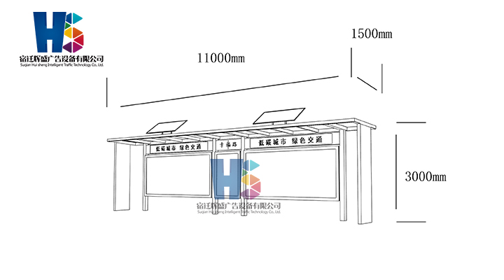 產(chǎn)品外觀 / PRODUCT DETAILS 產(chǎn)品信息 / PRODUCT INFO 【產(chǎn)品名稱】:新款候車亭HS21 【產(chǎn)品系列】:新款候車亭 【產(chǎn)品型號(hào)】:HS21 【產(chǎn)品規(guī)格】:長(zhǎng)11000mm 寬1500mm 高3000mm 【產(chǎn)品材質(zhì)】:熱鍍鋅鋼板 【使用年限】:10-15年 【詳情致電】:181-5189-0417、157-5170-8886 備注:產(chǎn)品可根據(jù)用戶需求選用材質(zhì)、顏色及配件,個(gè)性化定制。 1、表面采用靜電噴塑(氟碳烤漆/搪瓷處理) 2、頂棚采用100*100*1.5mm、100*150*2mm鍍鋅管,3mm鍍鋅板激光切割件、1.5mm鍍鋅板焊接骨架,鋪1mm鍍鋅板(10mm陽(yáng)光板) 3、立柱采用150*150*3mm鍍鋅管 4、箱體采用1.5mm鍍鋅板折彎焊接成型,門框采用全玻鋁合金型材,視窗采用6mm鋼化玻璃 5、照明電器采用LED燈粒 產(chǎn)品尺寸 / PRODUCT SIZE 關(guān)于輝盛 / 為社會(huì)分擔(dān)責(zé)任,為客戶創(chuàng)造價(jià)值 宿遷輝盛廣告設(shè)備有限公司是一家集設(shè)計(jì)、研發(fā)、生產(chǎn)為一體的城市公共設(shè)施生產(chǎn)型企業(yè)。主要產(chǎn)品有:候車公交亭、公交站臺(tái)、閱報(bào)欄、路名牌、垃圾箱、燈箱等市政設(shè)施系列產(chǎn)品和工程配套設(shè)施系列產(chǎn)品,現(xiàn)有高級(jí)技師30多人,高級(jí)職稱設(shè)計(jì)人員10人,是一家具有自主開發(fā)和設(shè)計(jì)能力的以公交亭、智能公交為主導(dǎo)的綜合性城市公共設(shè)施制造企業(yè)。為了進(jìn)一步改善生產(chǎn)工藝,提高產(chǎn)品質(zhì)量,公司引進(jìn)了先進(jìn)生產(chǎn)設(shè)備,包括立臥式加工中心,工業(yè)涂裝流水線,CNC車床,線切割機(jī),大型數(shù)控板機(jī),數(shù)控折邊機(jī),數(shù)控沖孔機(jī)床,大型折彎?rùn)C(jī)等。公司還專門成立了產(chǎn)品研發(fā)部門,現(xiàn)每年自主開發(fā)或應(yīng)客戶要求設(shè)計(jì)推出多款新產(chǎn)品。 榮譽(yù)資質(zhì) / ENTERPRISE HONOR