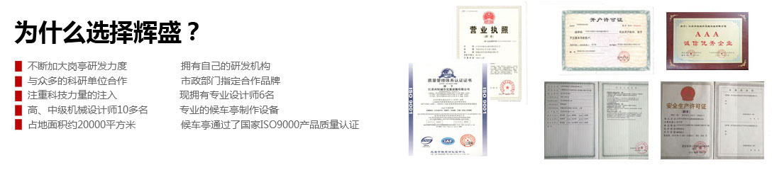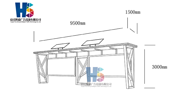 產(chǎn)品外觀 / PRODUCT DETAILS 產(chǎn)品信息 / PRODUCT INFO 【產(chǎn)品名稱】:新款候車亭HS1 【產(chǎn)品系列】:新款候車亭 【產(chǎn)品型號】:HS1 【產(chǎn)品規(guī)格】:長9500mm 寬1500mm 高3000mm 【產(chǎn)品材質(zhì)】:熱鍍鋅鋼板 【使用年限】:10-15年 【詳情致電】:181-5189-0417、157-5170-8886 備注:產(chǎn)品可根據(jù)用戶需求選用材質(zhì)、顏色及配件,個性化定制。 1、表面采用靜電噴塑(氟碳烤漆/搪瓷處理) 2、頂棚采用100*100*1.5mm、100*150*2mm鍍鋅管,3mm鍍鋅板激光切割件、1.5mm鍍鋅板焊接骨架,鋪1mm鍍鋅板(10mm陽光板) 3、立柱采用150*150*3mm鍍鋅管 4、箱體采用1.5mm鍍鋅板折彎焊接成型,門框采用全玻鋁合金型材,視窗采用6mm鋼化玻璃 5、照明電器采用LED燈粒 產(chǎn)品尺寸 / PRODUCT SIZE 關(guān)于輝盛 / 為社會分擔(dān)責(zé)任,為客戶創(chuàng)造價值 宿遷輝盛廣告設(shè)備有限公司是一家集設(shè)計、研發(fā)、生產(chǎn)為一體的城市公共設(shè)施生產(chǎn)型企業(yè)。主要產(chǎn)品有:候車公交亭、公交站臺、閱報欄、路名牌、垃圾箱、燈箱等市政設(shè)施系列產(chǎn)品和工程配套設(shè)施系列產(chǎn)品,現(xiàn)有高級技師30多人,高級職稱設(shè)計人員10人,是一家具有自主開發(fā)和設(shè)計能力的以公交亭、智能公交為主導(dǎo)的綜合性城市公共設(shè)施制造企業(yè)。為了進一步改善生產(chǎn)工藝,提高產(chǎn)品質(zhì)量,公司引進了先進生產(chǎn)設(shè)備,包括立臥式加工中心,工業(yè)涂裝流水線,CNC車床,線切割機,大型數(shù)控板機,數(shù)控折邊機,數(shù)控沖孔機床,大型折彎機等。公司還專門成立了產(chǎn)品研發(fā)部門,現(xiàn)每年自主開發(fā)或應(yīng)客戶要求設(shè)計推出多款新產(chǎn)品。 榮譽資質(zhì) / ENTERPRISE HONOR